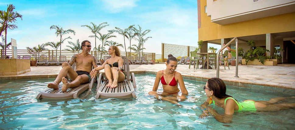 Hot Beach Suítes: perfeito para quem procura hospedagem para famílias maiores, com até 7 pessoas. Conta com suítes amplas, de 1 ou 2 quartos, com sala, varanda gourmet com churrasqueira, cozinha equipada com cooktop, microondas, geladeira e utensílios, além de smart TVs em todos os ambientes. Do lado de fora, as atrações e as facilidades continuam: piscina com água quente, espaço kids, equipe de lazer, academia, lojas de conveniência, bares e restaurante com receitas regionais e bebidas não alcoólicas inclusas nas refeições. Também é anexo aos parques Hot Beach Olímpia e Vila Guarani, com portaria exclusiva e acesso livre para todos os hospedes durante os dias de funcionamento dos parques.